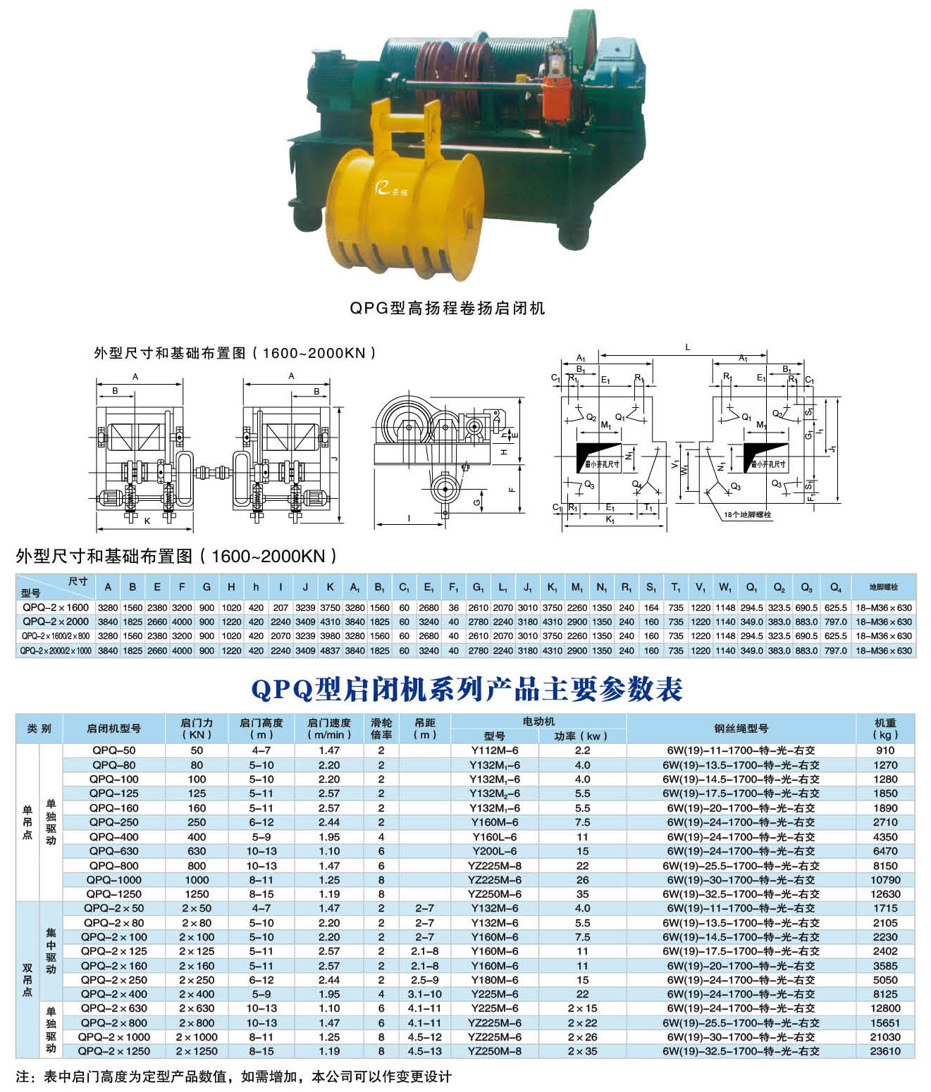 卷揚啟閉機有多種型號:可以分為QPQ型普通卷揚啟閉機、QPK型快速卷揚啟閉機、QPG型高揚程卷揚啟閉機、QPT型臺車式卷揚啟閉機,QPM型門式卷揚啟閉機,QH型弧門卷揚啟閉機。卷揚啟閉機又分為:平門卷揚式啟閉機;弧形門卷揚式啟閉機;雙吊點卷揚式啟閉機;快速卷揚式啟閉機;移動式臺車啟閉機;雙吊點卷揚式啟閉機分為:集中驅(qū)動和單獨驅(qū)動兩種;卷揚式啟閉機手搖、電動兩用式規(guī)格分為:5噸、8噸、12噸、16噸、25噸;電動式規(guī)格分為:40噸、63噸、80噸、100噸、125噸、160噸、200噸,可以根據(jù)用戶要求設(shè)計,并能生產(chǎn)雙吊點卷揚式啟閉機,該機是一種水利工程專用機械,廣泛用于水利工程閘門的啟閉,是農(nóng)田灌溉、水產(chǎn)養(yǎng)殖、農(nóng)業(yè)經(jīng)濟開發(fā)區(qū)、污水處理廠、水利發(fā)電站、水庫(水閘、堤壩、隧道、管 道)等進水、退水閘的配套機械,山區(qū)、平原有、無電地區(qū)均可使用。