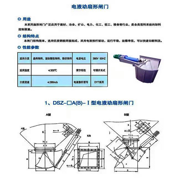 扇形閘門由本體、扇形閘板、軸、密封、執(zhí)行機構(gòu)等部件構(gòu)成;手動或執(zhí)行機構(gòu)推動搖桿使扇形閘板沿軸心旋轉(zhuǎn)開啟,物料隨即下落;待接料裝置滿載后再推動搖桿使扇形閘板復(fù)位,關(guān)閉截斷下落的物料。