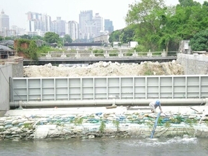 在水利水電建設(shè)中,隨著城市用水、景觀建設(shè)及環(huán)境整治和灌溉、發(fā)電的需要,翻板閘,水閘和橡膠壩得到廣泛的運用。然而,橡膠壩等生產(chǎn)比較復(fù)雜,運行時充水(充氣)升壩或放水(放氣)塌壩時間較長,影響快速截流或泄洪,再加上橡膠易老化的弊端,容易發(fā)生質(zhì)量事故。現(xiàn)在市場上出現(xiàn)大量鋼結(jié)構(gòu)閘門,或翻板閘但無論是提升式或臥倒式,單孔都很難適用較寬的河道。鋼壩閘是一種新型可調(diào)空控溢流閘門,它有土建結(jié)構(gòu)、帶固定軸的鋼閘門門體、啟閉設(shè)備等組成。這種建筑物適合于閘孔較寬(10米~~100米)而水位差比較小的工況(1~~7米),由于它可以設(shè)計的比較寬,可以省區(qū)數(shù)孔閘墩,所以不僅結(jié)構(gòu)簡單,可以節(jié)省不少土建投資,而且可以立門蓄水,臥門行洪排澇,適當開啟調(diào)節(jié)水位,還可以利用閘門門頂過水,形成人工瀑布的景觀效果。
